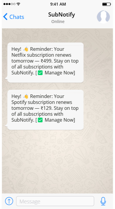 We track your subscriptions from Gmail and send reminders on WhatsApp before renewal. No more surprise charges.